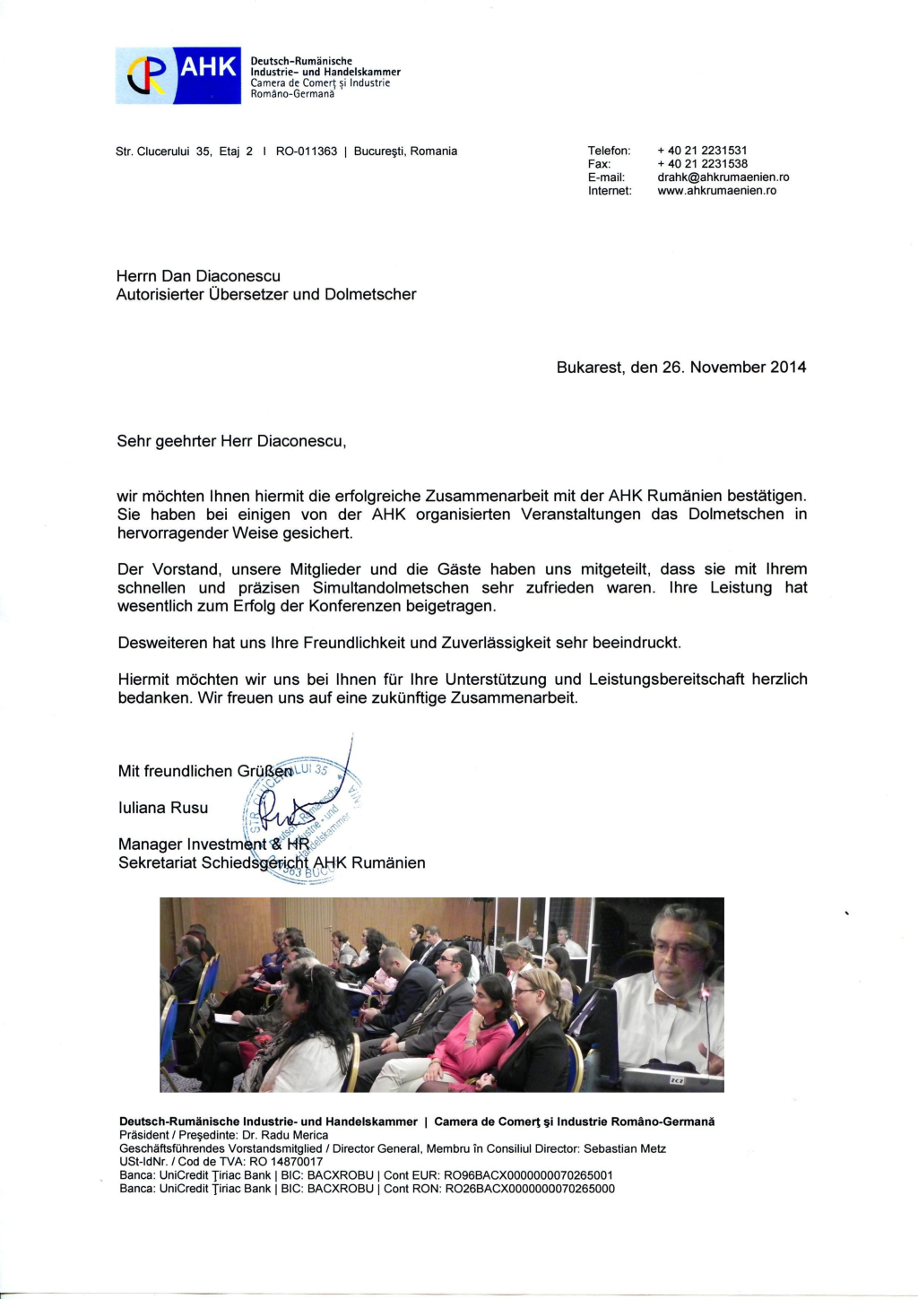 Die mehr als 20 Jahre an Erfahrung im Bereich der Simultanübersetzungen im Dienste von Spitzenvertreter der rumänischen Politik (Staatspräsidenten, Ministerpräsidenten, Minister, Senatoren und Abgeordneten, Bürgermeister) im Verlauf von In- und Auslandsgesprächen bilden eine Garantie für Professionalismus, Ernsthaftigkeit und Diskretion.
